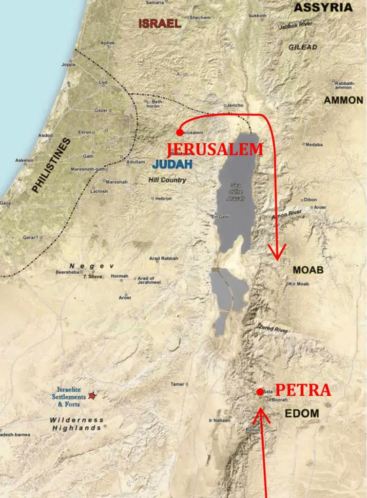 Daniel chapter 11 describes the battles between the king of the North and the King of the South. Beginning with verse 40 we learn that at the “time of the end” the King of the North (The Beast of Revelation) will prevail and will conquer the Holyland(v41) and the surrounding areas of the Middle east. However, there are three areas that will be spared from the King of the North: Edom, Moab and Ammon. If you are escaping Israel (Mat 24:16), you will need to travel through Ammon and Moab to get to Petra. If you are coming from the South you will need to travel through Edom to get to Petra.