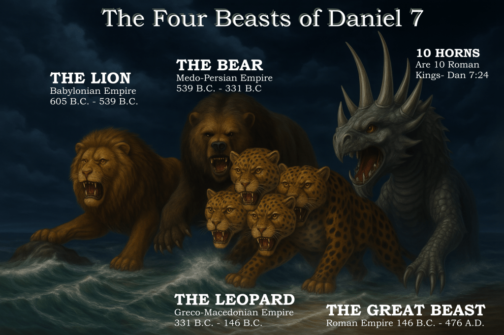 The most important connection to note is that these four beasts combined are identical to the description of the Beast of Revelation 13 made up of a Lion, Bear, Leopard and a fourth Great and Terrible Beast. So instead of having 2 parallel visions we now have 3– with the lion representing the Babylonian Empire. The bear representing the Medo-Persian Empire, the four headed leopard representing the four divisions of the Greco-Macedonian Empire and the Great Beast being the Roman Empire.
