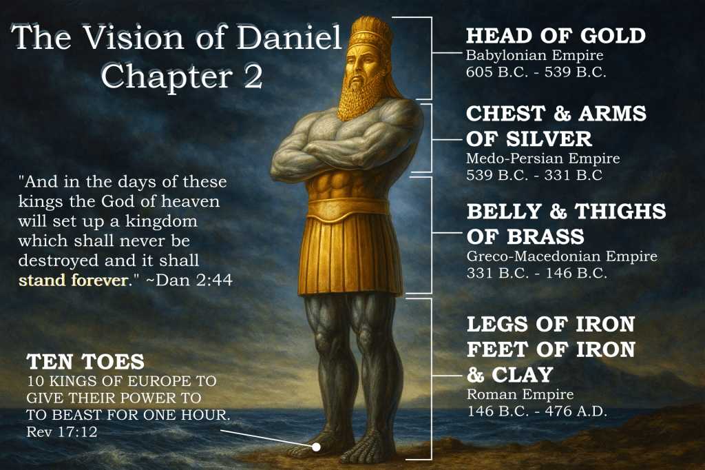 One of the clearest and best outlines in all of bible prophecy is the image of Nebuchadnezzar in Daniel chapter two. This vision is a straight forward description of world events from the time of Daniel to the time of the end. In Daniel chapter 2 verse 32 we learn of a statue that: