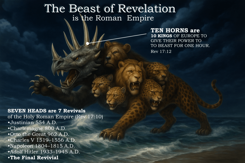 In addition to Rome being known commonly as the “City of Seven Hills” these seven heads also represent seven kings who come and go over the course of time. This explains how “the world will marvel to see the beast, because it was and is not and is to come.”(Rev17:8 ESV) The world will be amazed to see how this Roman system continues to revive itself again and again.