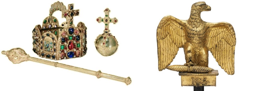 Napoleon Bonaparte (1804–1815) Although from noble family from Cosica, Italy- Napoleon had no documented ancestral line from Charlemagne. Never the less, he consciously and strategically presented himself as the successor and heir to Charlemagne’s legacy. Napoleon was crowned Holy Roman Emperor by Pope Pius the VII. In his regalia he wore the crown, sword and scepter of Charlemagne (Imperial Regalia). He chose the Roman eagle as his standard and mimicked Roman governance and military tactics. Although Napoleon himself did not appear to be antisemitic, his alliance with the Roman Catholic Church empowered antisemitism. Napoleon imposed his “infamous decrees” in 1808 that greatly restricted Jewish economic freedoms and canceled debts owed to Jews. These decrees also included forced / mandated assimilation of Jews into French Society.